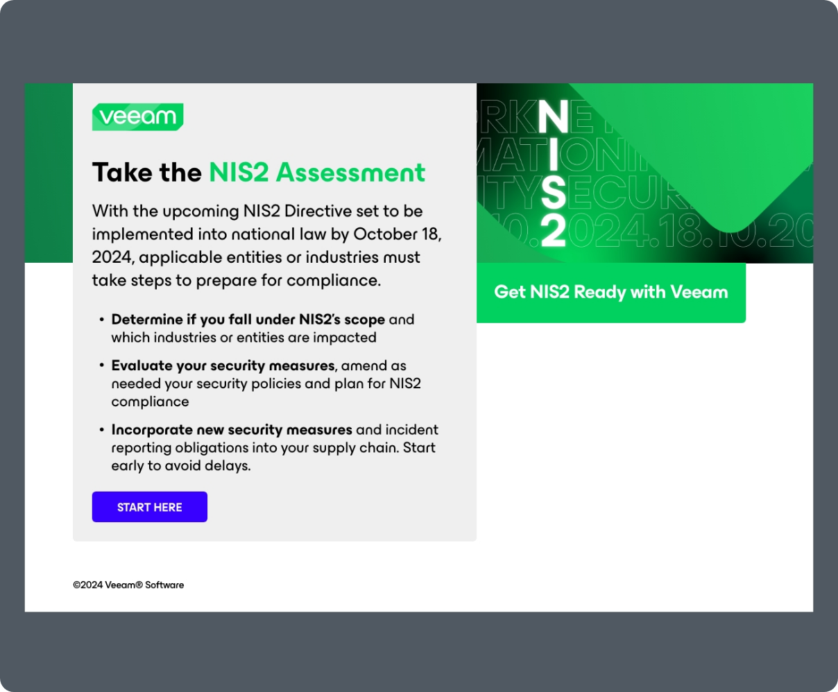 2024 was a huge growth year for Security vendors and the NIS2 directive deadline created a very competitive space. We wrote, designed and executed digestible content in the form of Whitepapers, infographics, checklists etc. including marketing enablement assets for partners to position Veeam as a solution for compliance and data security. We even created a short survey for resellers to discover if their customer needed to comply.